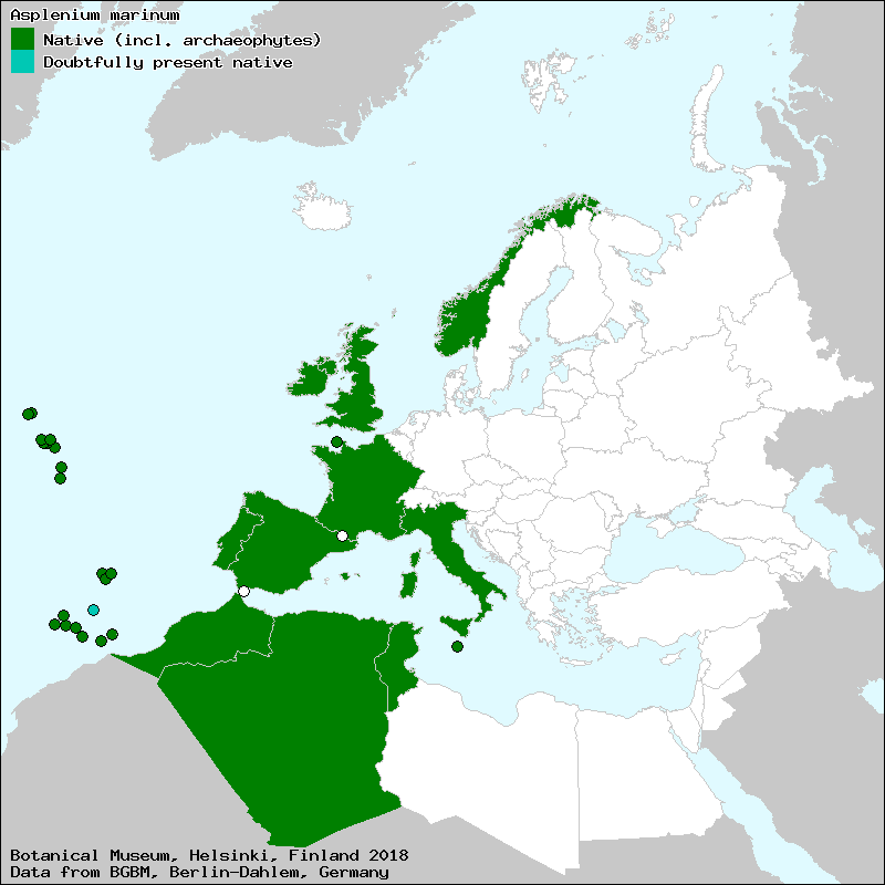 Asplénium marin (French), Doradille marine (French), Fionncha mara (Irish Gaelic), Sea Spleenwort (English), Asplénie marine (French), culantrillo de mar (Spanish, Castillian), doradilla marina (Spanish, Castillian), Doradille marine (French), Duegredynen Arfor (Welsh), falzia marina (Catalan), fento mariño (Galician), havburkne (Norwegian), havsbräken (Swedish), helecho marino (Spanish, Castillian), Kyst-Radeløv (Danish), meriraunionen (Finnish), Sea Spleenwort (English)[Credits] |