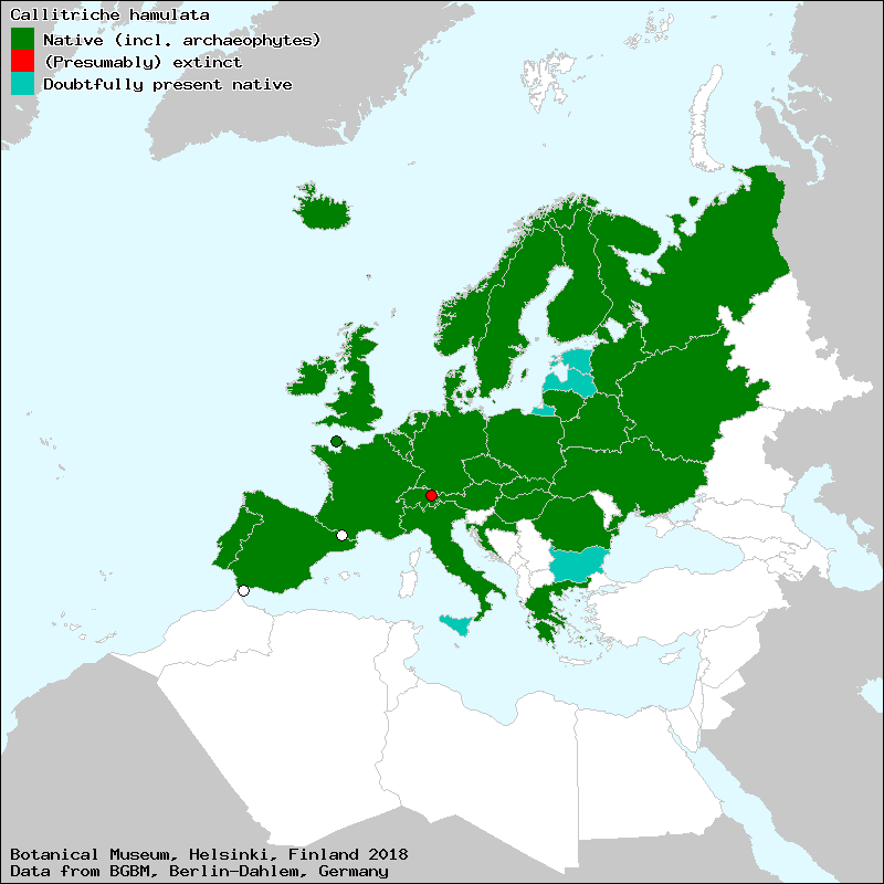 Uotila, P. (2017+): Callitriche. – In: Euro+Med Plantbase - the information resource for Euro-Mediterranean plant diversity. This work is licensed under a Creative Commons Attribution-ShareAlike 3.0 Unported license (CC-By-SA-3.0 Unported).