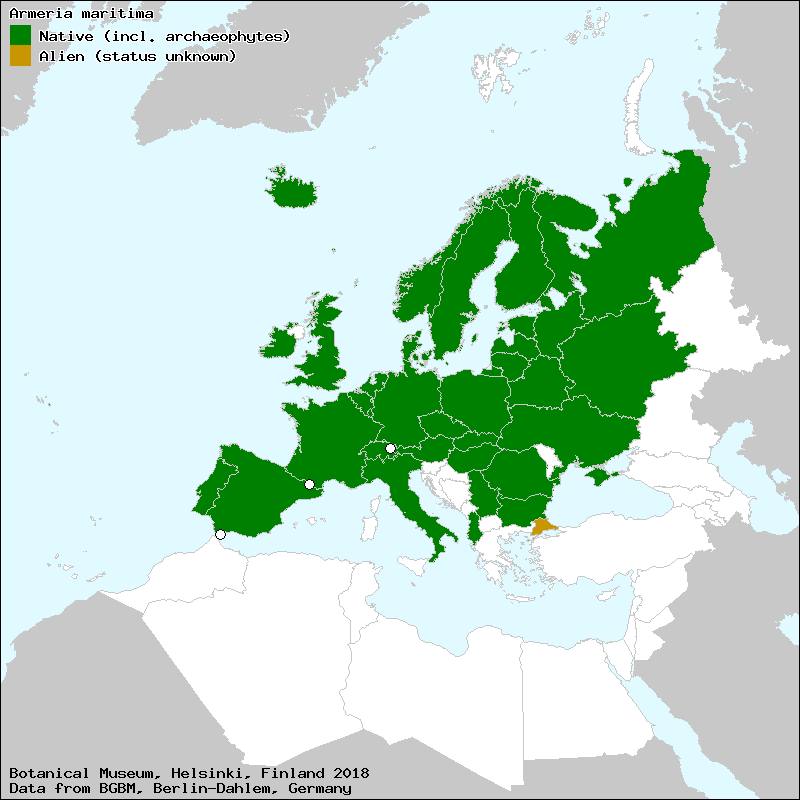 Arméria maritime (French), Armérie maritime (French), armeria (Spanish, Castillian), Armeria bregdetare (Albanian), caravel mariño (Galician), carqueixa mariña (Galician), césped (Spanish, Castillian), césped francés (Spanish, Castillian), clavel de playas (Spanish, Castillian), cravo mariño (Galician), cravo romano (Portuguese), dengue (Spanish, Castillian), denguecillos (Spanish, Castillian), erizo de la sierra (Spanish, Castillian), estancadeira (Portuguese), estatice-erizo (Spanish, Castillian), gasó (Catalan), gazón (Spanish, Castillian), Gazon d’Espagne (French), Gazon d’Olympe (French), Gewöhnliche Grasnelke (German), herba de namorar (Galician), herba de raposo (Galician), herba empreñadeira (Galician), herba empreñadoira (Galician), herba namoradeira (Galician), herba namoreira (Galician), Herbe à sept têtes (French), itsas krabelin (Euskera), itsas krabelina (Euskera), Jonc marin (French), jūrmalas armērija (Russian), mermasangre (Aragonese), Oeillet marin (French), primorska svilica (Croat), Rabhán (Irish Gaelic), relva-de-espanha (Portuguese), relva-do-olimpo (Portuguese), té (Aragonese), trávnička prímorská (Slovak), Zawciąg pospolity (Polish), армерия приморская (Russian)[Credits] |