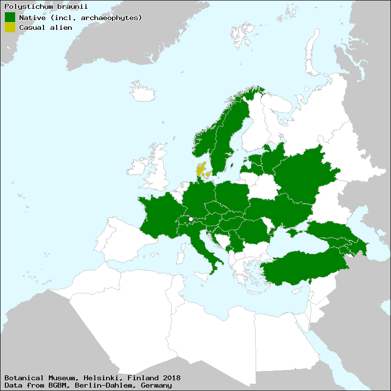 Polystic de Braun (French), Schuppen-Schildfarn (German), Alex.Brauns Schildfarn (German), Brauna cietpaparde (Latvian), braunova podlesnica (Slovene), Braun-Schildfarn (German), Creasta cocoşului (Roumanian), dlakava papratnjača (Croat), Felce di Braun (Italian), junkerbregne (Norwegian), kapradina Braunova (Czech), papraďovec Braunov (Slovak), Paprotnik Brauna (Polish), polystic de Braun (French), skuggbräken (Swedish), smalbladet Skjoldbrgne (Danish), Szőrös vesepáfrány (Hungarian), Weicher Schildfarn (German), Zarter Schildfarn (German), багаторядник Брауна (Ukraine), Браун ҹəркəвəр (Azerbaijan), многорядник Брауна (Russian), многорядник Брауна (Ukraine)[Credits] |