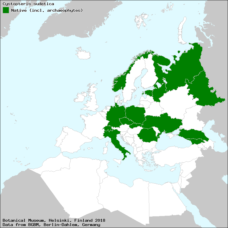 Paprotnica sudecka (Polish), pľuzgiernik sudetský (Slovak), puchýřník sudetský (Czech), Sudeedi põisjalg (Estonian), sudetbräken (Swedish), Sudeten-Blasenfarn (German), Sudetisk Bægerbregne (Danish), sudetlok (Norwegian), пузырник судетский (Russian), пухирник судетський (Ukraine)[Credits] |
