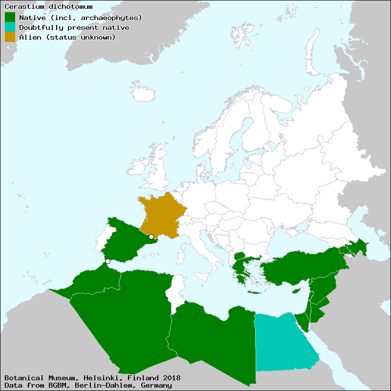 Céraiste dichotome (French), קַרְנוּנִית דּוּ-בַּדִּית (Israel (Hebrew)), alcubilla (Spanish, Castillian), Boynuz otu (Turkish), cabeza de tordo (Spanish, Castillian), gaffelarv (Swedish), hankahärkki (Swedish), Hornkraut (German), Starwort (English), Κεράστιον το διχότομον (Greek), Һачалы дəли ҹинҹилим (Azerbaijani), קרנונית מדוקרנת (Israel (Hebrew))[Credits] |