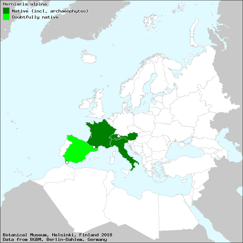 Common names: Herniaire des Alpes (French), Alpen-Bruchkraut (German), Erniaria alpina (Italian), Herniaire des Alpes (French), herniària alpina (Catalan)[Credits]