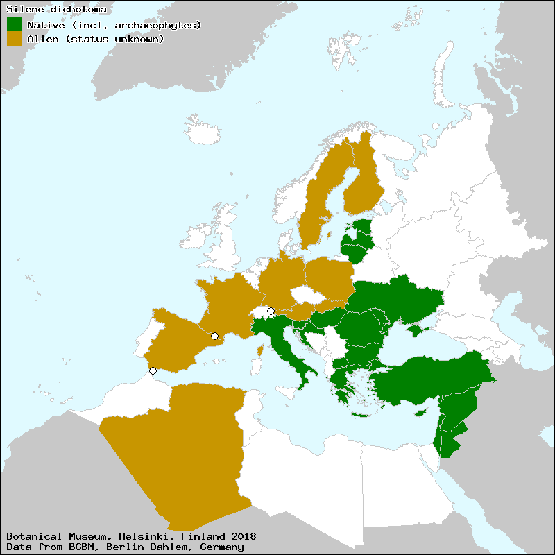 Silène bifurqué (French), Silène dichotome (French), Silène fourchu (French), צִפָּרְנִית עֲנֵפָה (Israel (Hebrew)), Forked Catchfly (English), Gabeliges Leimkraut (German), Gabel-Leimkraut (German), gaffelglim (Swedish), Gaffel-limurt (Danish), Gaffelsilene (Dutch), gaffelsmelle (Norwegian), hankakohokki (Finnish), Lepnica dwudzielna (Polish), Nakil (Turkish), rašljastogrozdasta pušina (Croat), Silene dicotoma (Italian), Silène fourchue (French), silenka pavidlicovitá (Slovak), silenka rozsochatá (Czech), Vilasta lepnica (Slovene), Villás habszegfű (Hungarian), Σιληνή η διχότομος (Greek), Σιληνή η Σιβθόρπειος (Greek), Гуша порумбарулуй дихотомэ (Moldovian), Дихотомно плюскавиче (Bulgarian), смолевка вильчатая (Russian)[Credits] |