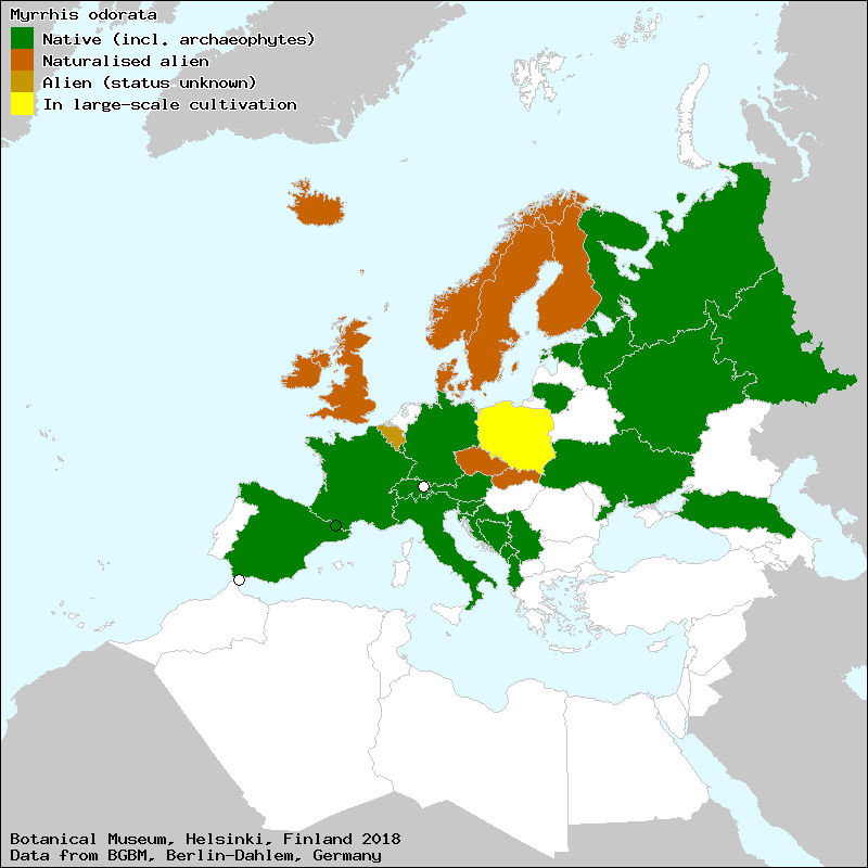 anís (Asturian), anís (Spanish, Castillian), anises (Asturian), anises (Spanish, Castillian), anisinos (Asturian), anisinos (Spanish, Castillian), ceguta sana (Spanish, Castillian), cerefolho de cheiro (Portuguese), cerefolio almizclado (Spanish, Castillian), cicutaria (Spanish, Castillian), mirra olorosa (Spanish, Castillian), mirride (Spanish, Castillian), mirris (Catalan), perifollo almizclado (Spanish, Castillian), perifollo oloroso (Spanish, Castillian), quijones olorosos y de buen sabor (Spanish, Castillian)[Credits] |