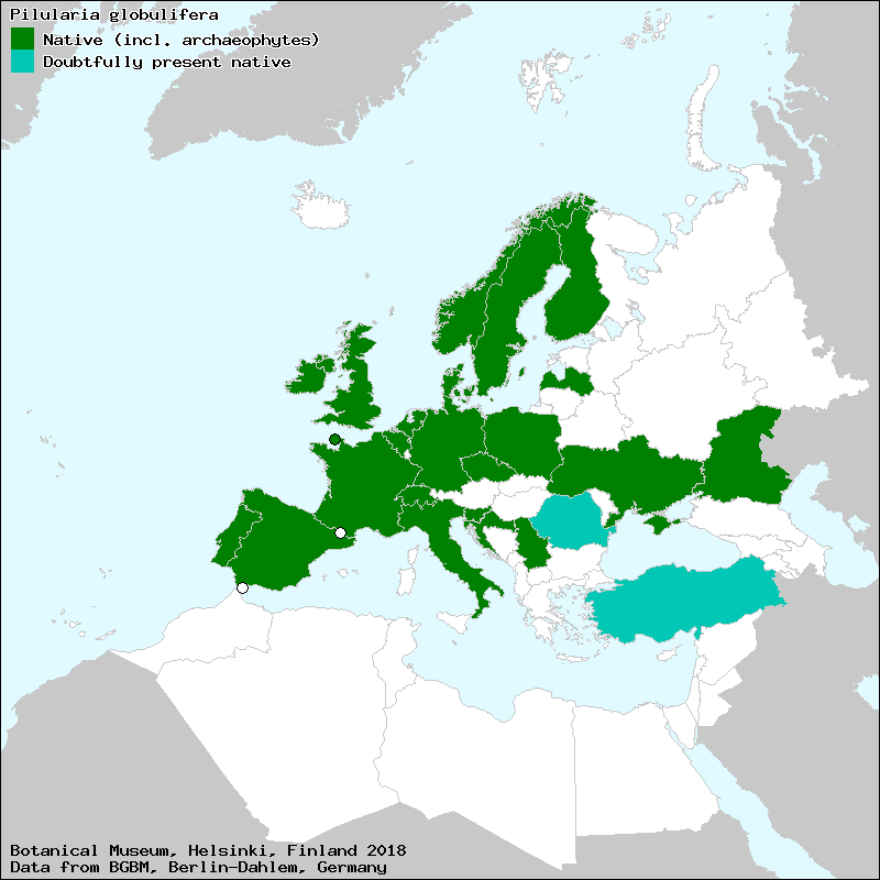 Lus an phiollaire (Irish Gaelic), Pillwort (English), Pilwort (English), klotgräs (Swedish), kroglasta osvaljkarica (Slovene), loptarka (Croat), míčovka kulkonosná (Czech), ormio (Finnish), Pelenllys (Welsh), Pilledrager (Danish), Pillenfarn (German), Pilulaire à globules (French), Pilularia comnue (Italian), Pilvaren (Dutch), trådbregne (Norwegian), Лоптарка (Serbian), Пiлюльниця куленосна (Ukraine), Пилюльница шариконосная (Russian)[Credits] |