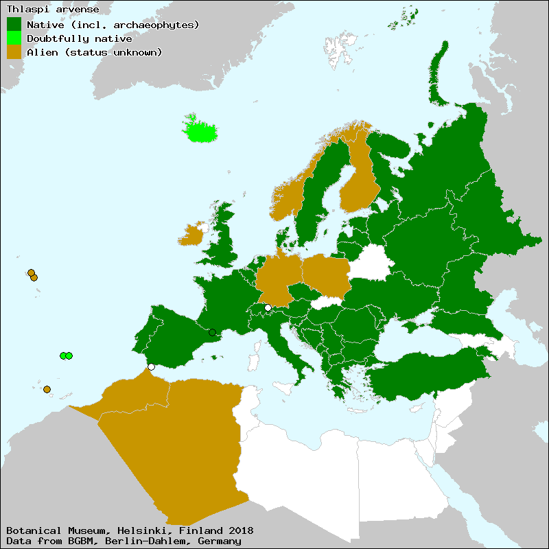 carraspique (Spanish, Castillian), Çöl yarğanotu (Azerbaijan), Dirvinė čiužutė (Lithuanian), mostaza salvaje (Spanish, Castillian), Põld-litterhein (Estonian), talaspico (Spanish, Castillian), telaspio (Spanish, Castillian), telaspios (Spanish, Castillian), thlaspio (Portuguese), thlaspo arvense (Portuguese), Tīruma naudulis (Latvian), tlaspios (Spanish, Castillian), traspic (Catalan), traspic de camp (Catalan), Полска попова лъжичка (Bulgarian), Пунгулицэ де-кымп (Moldovian), Талабан польовий (Ukraine), Ярутка полевая (Russian)[Credits] |