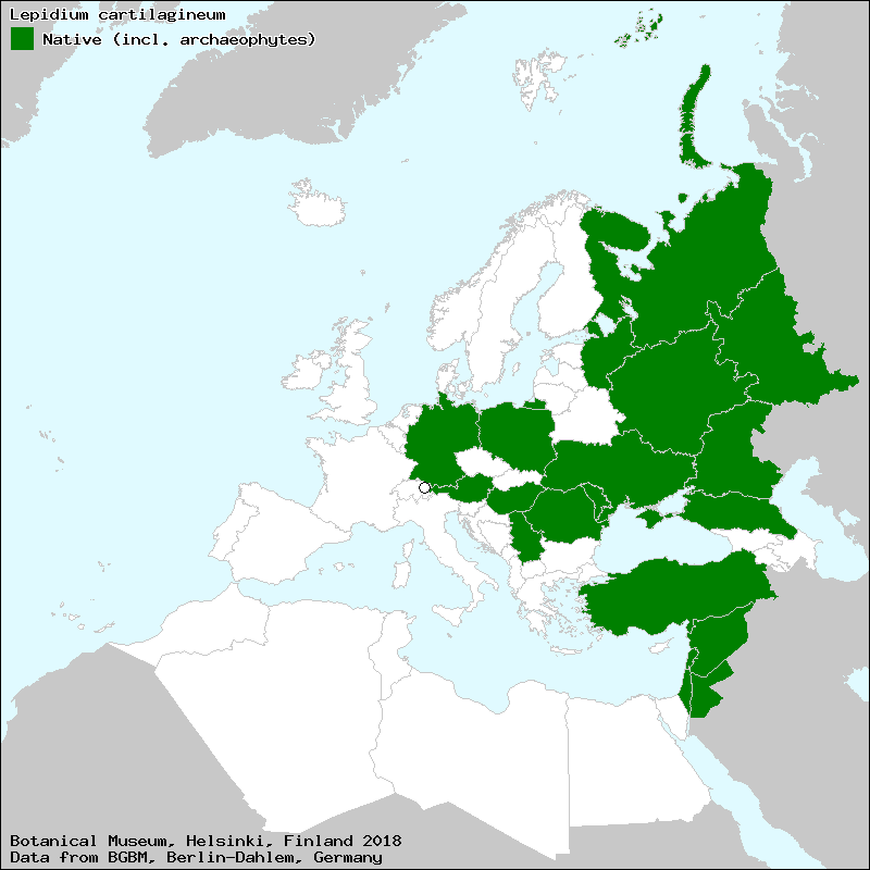 "Lepidium cartilagineum" sec. TUTIN, T. G. & al. (ed.) - Flora europaea. Cambridge University Press, Cambridge, 1964-1980. 1: [i]-xxxii, [ii], [1]-464. 1964; 2: [i]-xxvii, [iii], [1]-[455]. 1968; 3: [i]-xxix, [iii], [1]-370. 1972; 4: [i]-xxix, [iii], [1]-505. 1976; 5: [i]-xxxvi, [ii], 1-452. 1980. |