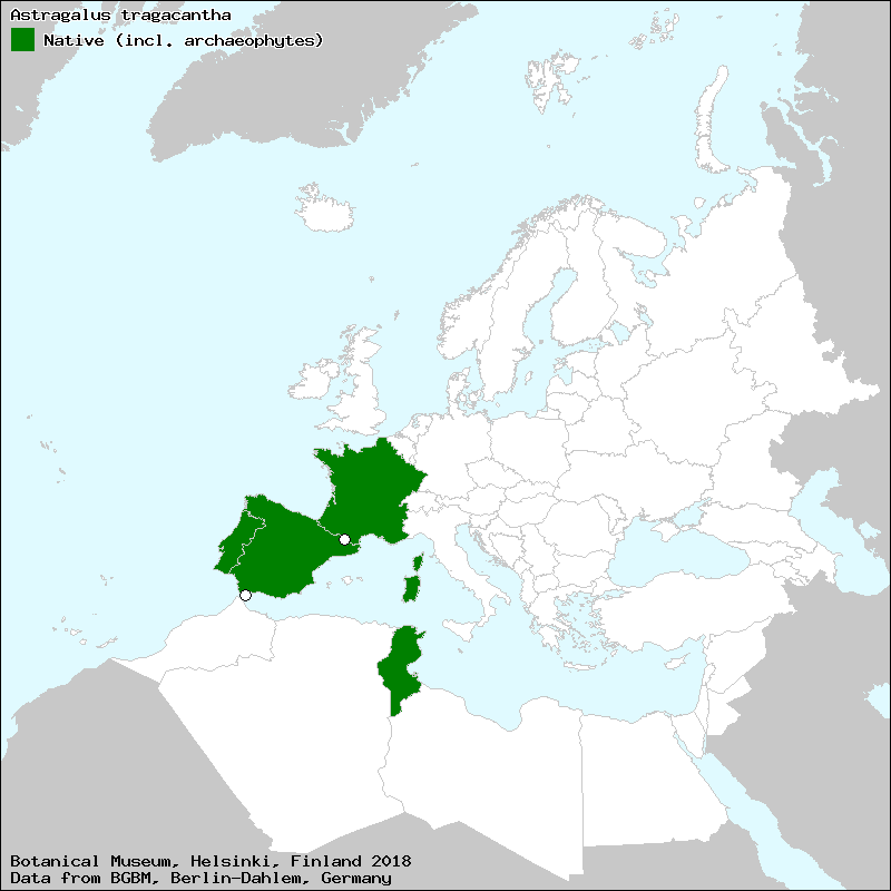 alquitera (Spanish, Castillian), alquitira (Spanish, Castillian), alquitira do Algarve (Portuguese), alquitira-do-Algarve (Portuguese), axorba-ratas negre (Majorcan), cadira de pastor (Catalan), cadireta de pastor (Valencian), cat (Catalan), coixí de monja (Catalan), coixí de senyora (Catalan), cujins de monja (Catalan), cuxins de monja (Catalan), gatobell (Majorcan), granevano (Spanish, Castillian), likale-churibat (Euskera), socorrella (Majorcan), tragacant de Marsella (Catalan)[Credits] |