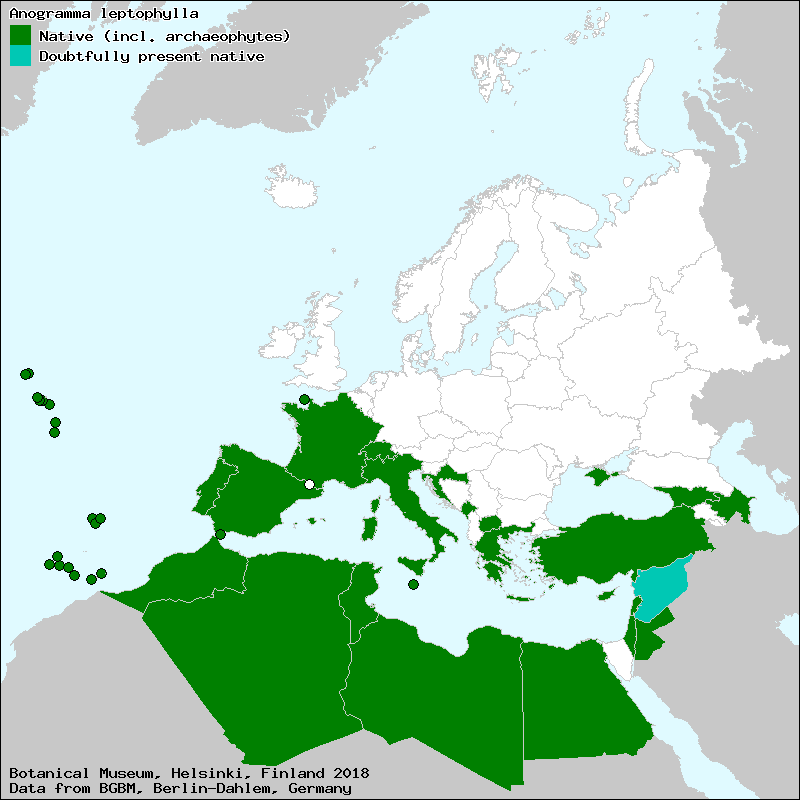 Anogramma à feuilles minces (French), Anogramme à feuilles minces (French), Dünn-Nacktfarn (German), Jersey Fern (English), Annual Maidenhair (English), Anogramma a foglie sottili (Italian), Anogramma à frondes minces (French), Anogramme à frondes minces (French), Anogramme à limbe mince (French), Felcetta annuale (Italian), Grammitis (French), helecho de tiempo (Spanish, Castillian), Nacktfarn (German), tankolisni goliš (Croat), Tursin ir-riħ (Maltese), Анограма тонколиста (Ukraine), Анограмма тонколистная (Russian), Назикярпаг анограмма (Russian)[Credits] |