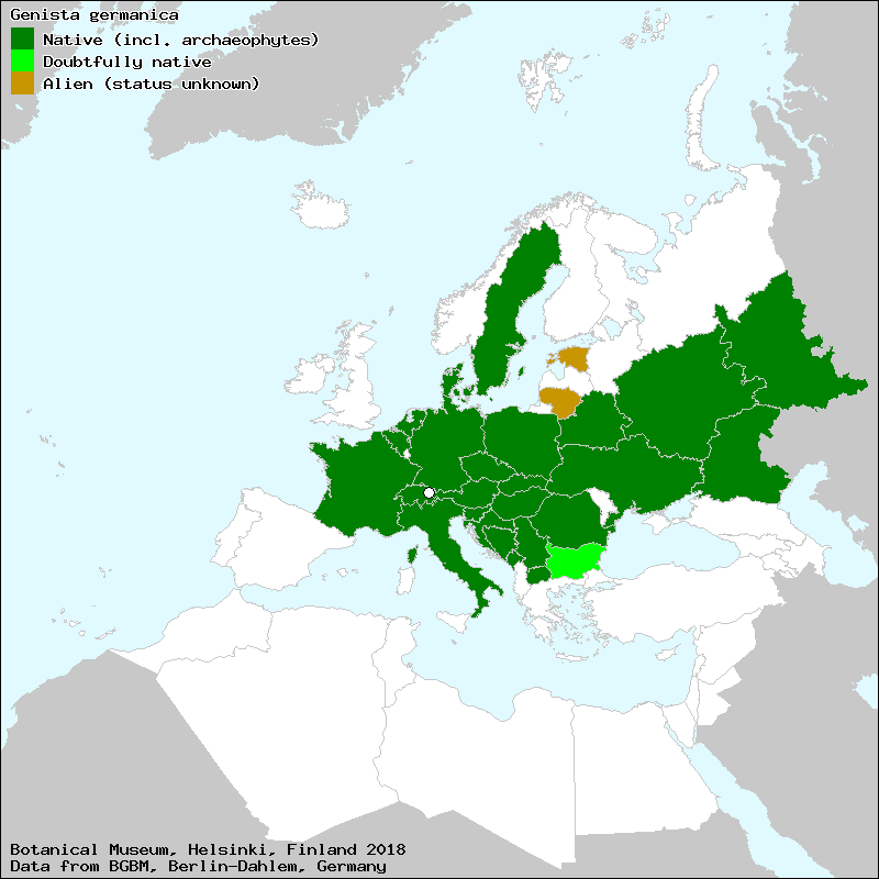 Deutscher Ginster (German), Drik Germanski (Ukraine), Drok Germanski (Russian), Genet D’Allemagne (French), Kolkaya Trava (Belarusian), Saksamaa Leetropoosas (Estonian), Vokietinis Prorirnis (Lithuanian), Zhaoutazel Germanski (Belarusian)[Credits] |