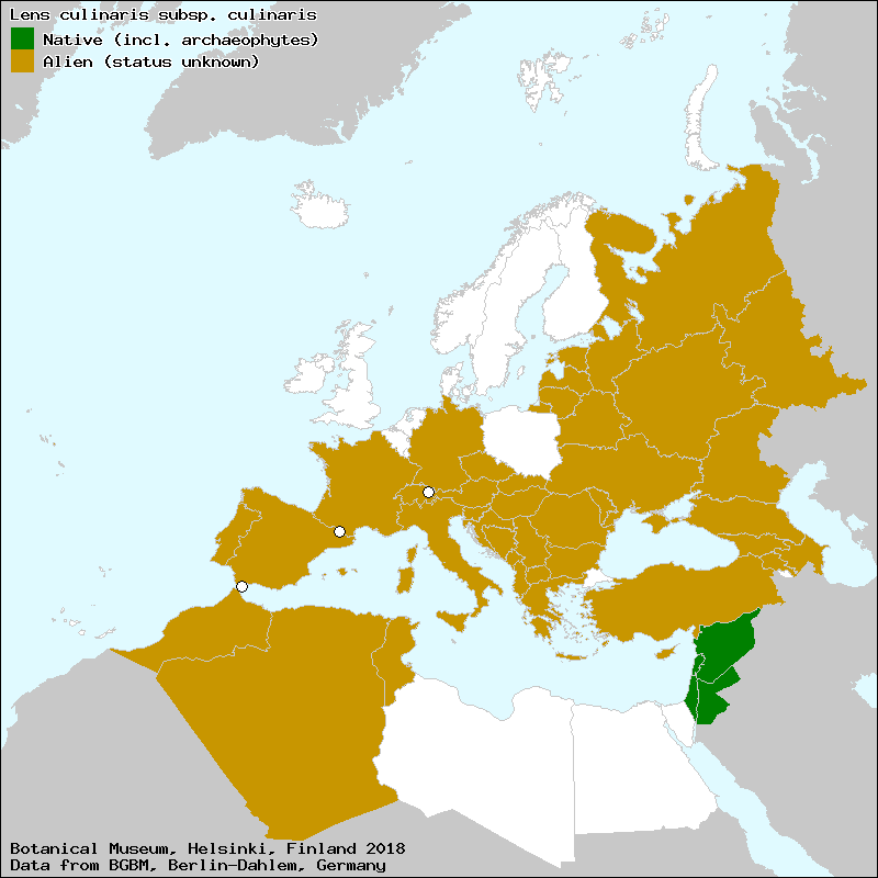 Constitutes an important source of protein in many communities., E.Barulina (1930, 1937) treated this species as L. esculenta, Native to the Middle East., Seed protein content is high (about 25%)., World production 3.1 M tonnes on 3.3 M hectares in 2000. |