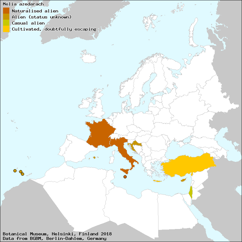 acederaque (Spanish, Castillian), agriaz (Spanish, Castillian), agrión (Spanish, Castillian), amargoseira (Portuguese), amargoseira-bastarda (Portuguese), amargoseira-do-Himaláia (Portuguese), amèlia (Catalan), árbol de cuentas (Spanish, Castillian), árbol de los rosarios (Spanish, Castillian), árbol de rosarios (Spanish, Castillian), árbol del Paraíso (Spanish, Castillian), árbol santo (Spanish, Castillian), arbre de grau de Rosari (Catalan), arbre de sabonetas (Catalan), arbre de sabonetes (Catalan), arbre del Paradis (Majorcan), arbre sant (Catalan), árvore-dos-rosários (Portuguese), azedarac (Valencian), azederach (Spanish, Castillian), azederaque (Portuguese), azufeifo (Portuguese), bolillero (Spanish, Castillian), cimnamomo (Spanish, Castillian), cinamom (Majorcan), cinamomo (Galician), cinamomo (Spanish, Castillian), cinamono (Spanish, Castillian), cinnamomo (Spanish, Castillian), conteira (Portuguese), falso-sicómoro (Portuguese), gessamí d’America (Catalan), lila (Spanish, Castillian), lilà de les Índies (Catalan), lilà de Persia (Catalan), lila de Persia (Spanish, Castillian), lilo (Spanish, Castillian), llessamí d´Amèrica (Catalan), mèlia (Catalan), mélia (Portuguese), melia (Spanish, Castillian), metziner (Catalan), metzines (Catalan), paraíso (Spanish, Castillian), parenostre (Catalan), patenostre (Majorcan), rosarier (Catalan), rosariera (Spanish, Castillian), siccomoro (Portuguese), sicómoro-bastardo (Portuguese), sycomoro bastardo (Portuguese), xuclamoro (Catalan), xuclamoro (Majorcan), Αγριοπασχαλιά (Greek), Κομπολογόδεντρο (Greek), Λουλουδιά (Greek), Μαυρομμάτα (Greek), Μελιά (Greek), Μελιάδι (Greek), Μοσχοκαρφιά (Greek), Πασχαλιά (Greek), Σολωμός (Greek), τισπηχιά (Greek), Ψευδοπασχαλιά (Greek)[Credits] |