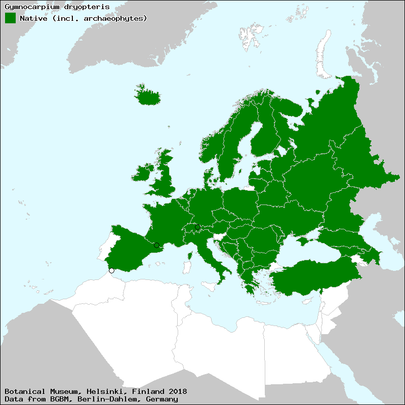 Cienistka trójkątna (Polish), Eichenfarn (German), Oak Fern (English), Polypode dryoptère (French), Polypode du Chêne (French), Raithneach dharach (Irish Gaelic), bukovník kapraďovitý (Czech), driopteria (Spanish, Castillian), Eichenfarn (German), ekbräken (Swedish), Felce delle querce (Italian), feto de carvalho (Spanish, Castillian), Fougère du Chêne (French), fugletelg (Norwegian), Gebogen driehoeksvaren (Dutch), gimnocarpi silicícola (Catalan), gimnocarpi silicícola (Spanish, Castillian), Gymnocarpium dryoptère (French), Gymnocarpium dryoptéris (French), Gymnocarpium du chêne (French), Harilik kolmissõnajalg (Estonian), helecho encinal (Spanish, Castillian), kisela lastreja (Croat), Közönséges hármaslevelű-páfrány (Hungarian), Lineeja ozolpaparde (Latvian), Llawredynen y Derw (Welsh), metsäimarre (Finnish), ozolu kailpaparde (Latvian), Peračina dúbravová (Slovak), þrílaufungur (Icelandic), Tredelt Egebregne (Danish), trífingraður eikikampur (Faroese), trikampialapis tikrapapartis (Lithuanian), Veshkëngjashmja fierdushku (Albanian), Zachyłka trójkątna (Polish), Глатка папрат (Serbian), голокучник дубовий (Ukraine), голокучник дубовый (Russian), голокучник трехраздельный (Russian), голокучник щитовниковый (Russian), Дъбов гимнокарпиум (Bulgarian), Жимнокарпиу ферижиформ (Moldovian)[Credits] |