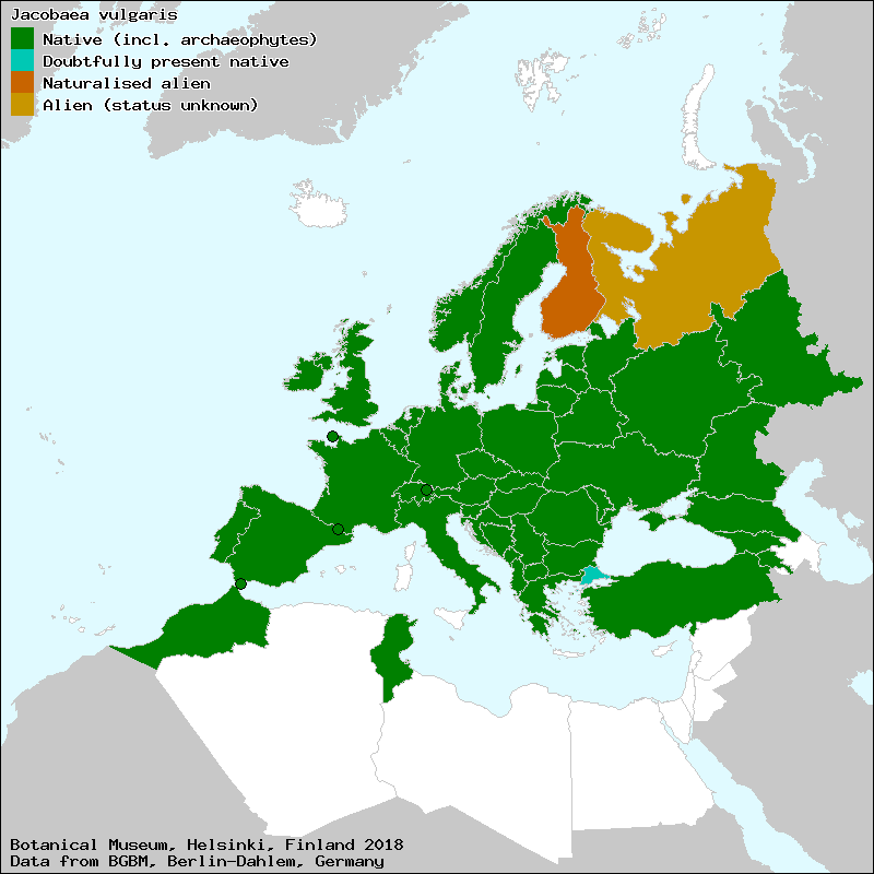 Common Ragwort (English), Eng-Brandbæger (Danish), Grintava trava (Croat), Herbe-de-Saint-Jacques (French), Jaakonvillakko (Finnish), Jakob-Greiskraut (German), Jakobkruiskruid (Dutch), Jakobov dragušac (Croat), Jakobov kostriš (Croat), Jakobov staračac (Croat), Jakobs-Greiskraut (German), Jakobs-Kreuzkraut (German), Jēkaba krustaine (Latvian), Kostriš veliki (Croat), Landøyda (Norwegian), Pievinė žilė (Lithuanian), Pulith i Jakobit (Albanian), Senecione di San Giacomo (Italian), Séneçon de Jacob (French), Séneçon jacobée (French), Šentjakobov grint (Slovene), Stånds (Swedish), Starček Jakubov (Slovak), Starzec Jakubek (Polish), Voolme-ristirohi (Estonian), Жовтозiлля лучне (Ukraine), Крестовник Якова (Russian), Кручулицэ де-лункэ (Moldovian), Якобов спореж (Bulgarian), Հալևորուկ Հակոբի (Armenian), afrentaquinteros (Spanish, Castillian), arnica (Aragonese), árnica (Galician), arnica (High Aragonese), arria (Spanish, Castillian), azuzón (Spanish, Castillian), cachapete (Spanish, Castillian), cálsamo (Aragonese), cálsamo (Galician), casanio (Galician), casanios (Galician), casanios (Portuguese), casanios (Spanish, Castillian), casimo (Galician), cazapeio (Spanish, Castillian), cazapete (Spanish, Castillian), cazapote (Spanish, Castillian), cibuta (Spanish, Castillian), clavel de sapo (Spanish, Castillian), copas (Spanish, Castillian), donzell de Canigó (Catalan), donzell del Canigó (Catalan), erva da talasma (Portuguese), erva-de-santiago (Galician), erva-de-santiago (Portuguese), fitas (Spanish, Castillian), flores mil (Aragonese), flores mil (High Aragonese), gazapeo (Spanish, Castillian), gusanera (Spanish, Castillian), herba crespa (Galician), herba de la fita (Catalan), herba de San Jaume (Catalan), herba de sant Jaume (Catalan), herba de Sant Jaume (Valencian), herba de Santiago (Galician), herba do Santiago (Galician), herba do sapo (Galician), herba do sapo (Portuguese), herba gavacha (Valencian), herba manteigueira (Galician), Herbe de saint Jacques (French), herva de Santiago (Portuguese), hierba cana (Spanish, Castillian), hierba cana mayor (Spanish, Castillian), hierba de Santiago (Aragonese), hierba de Santiago (Spanish, Castillian), hierba de sapo (Spanish, Castillian), hierba jacobí (Spanish, Castillian), hierba lombriguera (Spanish, Castillian), ixirisons (Valencian), oruga de Santiago (Spanish, Castillian), pella (Spanish, Castillian), sacapeos (Galician), sacapeos (Spanish, Castillian), saca-prada (Portuguese), seca ossos (Portuguese), serverola (Valencian), Šmarni križ (Slovene), suzón (Spanish, Castillian), suzón castellano (Spanish, Castillian), suzón real (Spanish, Castillian), tasna (Galician), tasna (Portuguese), tasneira (Galician), tasneira (Portuguese), usai gaistoco besatbat (Spanish, Castillian), vara de Santiago (Spanish, Castillian), yerba de Santiago (High Aragonese), yerba de Santiago (Spanish, Castillian), yerba desenmarinadera (High Aragonese), yerba incana (Spanish, Castillian), yerba jacobí (Spanish, Castillian), yerba lombriguera (Spanish, Castillian), yerba pico (High Aragonese), zuzón (Spanish, Castillian), Жовтозiлля Якова (Ukraine)[Credits] |