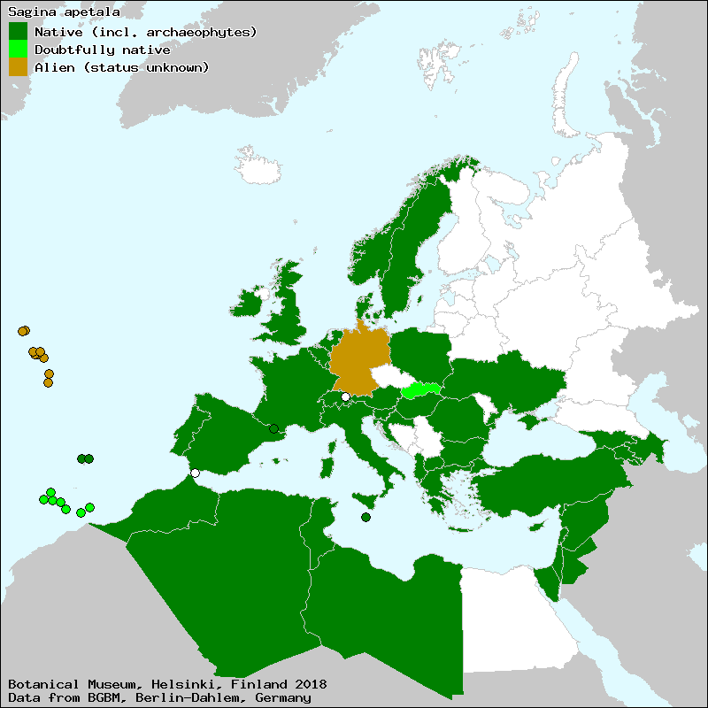 Sagine apétale (French), Sagine sans pétales (French), סָגִינָה זְעִירָה (Israel (Hebrew)), Annual pearlwort (English), Aufrechtes Mastkraut (German), Bewimpertes Mastkraut (German), bezlatična čvorika (Croat), Brezvenčni pitomec (Slovene), Corwlyddyn Anaf-flodeuog (Welsh), Corwlyddyn Cangehenog (Welsh), fältnarv (Swedish), hårarve (Norwegian), Håret Firling (Danish), hårnarv (Swedish), Karmnik bezpłatkowy (Polish), Kronblattloses Mastkraut (German), machovička bezkorunná (Slovak), machovička malokvetá (Slovak), Mark-Firling (Danish), Mongán lom (Irish Gaelic), Pillás zöldhúr (Hungarian), sagina apètala (Catalan), Sagina pa petla (Albanian), Sagina senza petali (Italian), Sagine dressée (French), Sagine eretta (Italian), Sagine sans pétales (French), Sziromtalan zöldhúr (Hungarian), Tengere vetmuur (Dutch), trådarve (Norwegian), úrazník brvitý (Czech), úrazník brvitý bezkorunný (Czech), úrazník brvitý pravý (Czech), uspravna čvorika (Croat), Wimper-Mastkraut (German), Σαγίνη η απέταλος (Greek), Σαγίνη η βλεφαριδωτή (Greek), Дребна мъховка (Bulgarian), Мамыроту безлепестная (Azerbaijani)[Credits] |