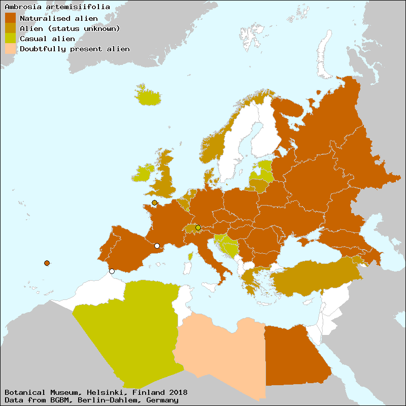 Alsemambrosia (Dutch), Ambroise élevée (French), Ambroisie à feuilles d’armoise (French), Ambroisie annuelle (French), Ambroisie élevée (French), Ambrosia con foglie di artemisia (Italian), Ambrozia gjethepelini (Albanian), Ambrózia palinolistá (Slovak), Ambrozie peřenolistá (Czech), Ambrozja bylicolistna (Polish), Aufrechte Ambrosie (German), Beifuß-Ambrosie (German), Beiskambrosia (Norwegian), Bynke-Ambrosie (Danish), Kietinė ambrozija (Lithuanian), Marunatuoksukki (Finnish), Navadna ambrozija (Slovene), Pelinolisni limundžik (Croat), Pujulehine ambroosia (Estonian), Vērmeļlapu ambrozija (Latvian), Амброзiя полинолиста (Ukraine), Амброзие пелинифолие (Moldovian), Амброзия полыннолистная (Russian), Јовшанјарпаг амброзија (Azerbaijan), Ամբրոզիա օշինդրատերև (Armenian), Ambroise à feuilles d’Armoise (French), Ambroise élevée (French), Herbe à poux (French), Pelinolistna ambrozija (Slovene)[Credits] |