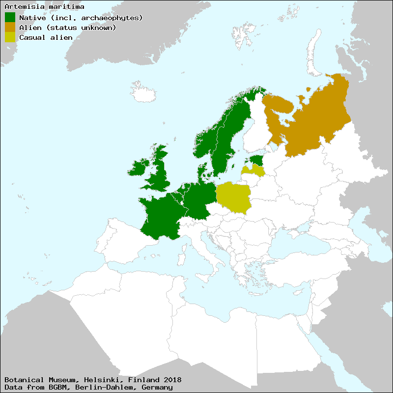 Armoise maritime (French), Bylica nadmorska (Polish), Ledinasti pelin (Croat), Merimaruna (Finnish), Meripuju (Estonian), Pelin polemorski (Croat), Primorski pelin (Croat), Sea Wormwood (English), Strand-Beifuß (German), Strandmalört (Swedish), Strand-Malurt (Danish), Strandmalurt (Norwegian), Zeealsem (Dutch), Полынь приморская (Russian), abrótano marino (Galician), Absinthe de mer (French), ajenjo marino (Spanish, Castillian), ajenjos marinos (Spanish, Castillian), altamisa de Portugal (Spanish, Castillian), artemisa marina (Spanish, Castillian), artemísia (Catalan), donsell mari (Catalan), donzell marí (Catalan), donzells marins (Majorcan), losna marina (Portuguese), Sémentine (French)[Credits] |