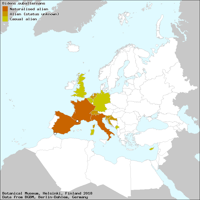 Bident à feuilles semi-alternes (French), Bident à folioles subalternes (French), Bident presque alterne (French), Forbicina del Rio Grande (Italian), Nenavadni mrkač (Slovene), Rio Grande-Zweizahn (German), madrastres (Catalan)[Credits]