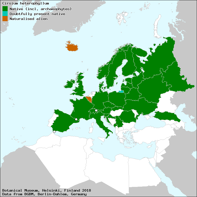 "Cirsium helenioides" sec. Scannell, M. J. P. & Synnott, D. M. - Census catalogue of the flora of Ireland, Ed. 2 Dublin 1987. |