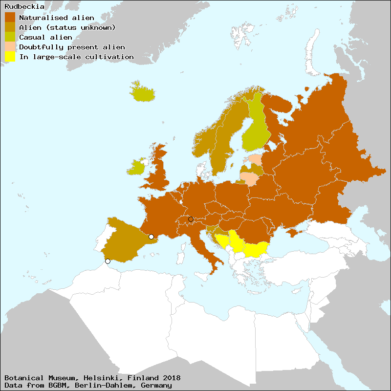 Rudbeckia (Dutch), Rudbeckia (Italian), Rudbeckie (German), Rudbeckior (Swedish), Rudbekia (Polish), Sonnenhut (German), Třapatka (Czech), Рудбекiя (Ukraine), Рудбекия (Russian), Ружь галбен (Moldovian)[Credits] |