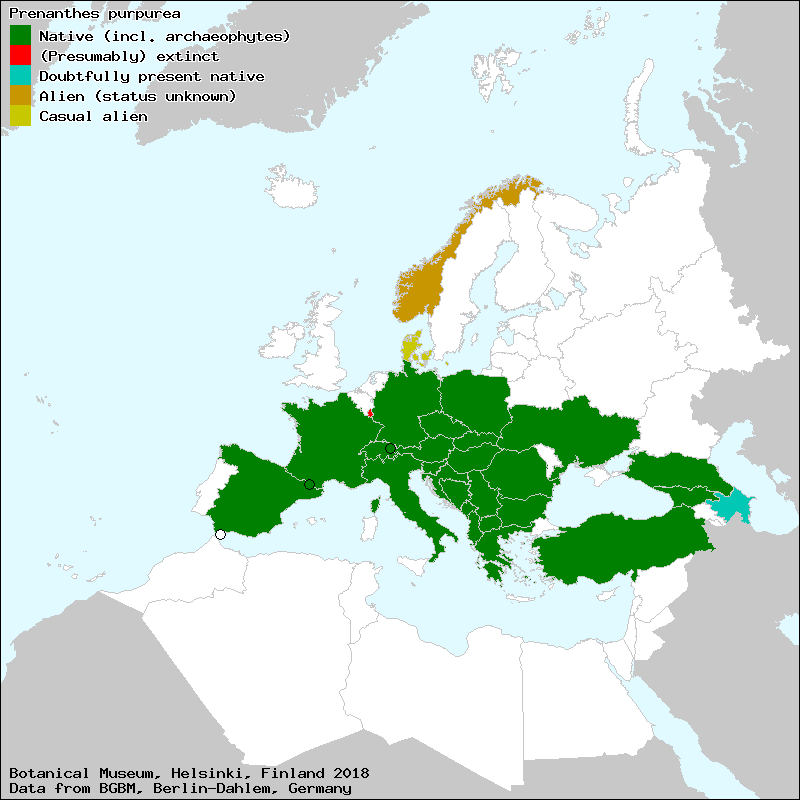 Hasenlattich (German), Lattuga montana (Italian), Prenante purpur (Albanian), Prénanthe pourpre (French), Prénanthès (French), Przenęt purpurowy (Polish), Purpur-Hasenlattich (German), Rödsallat (Swedish), Věsenka nachová (Czech), Шарен пурпурен багреник (Bulgarian), ajonjera (Spanish, Castillian), junquerina (Spanish, Castillian), prenantes (Catalan)[Credits] |