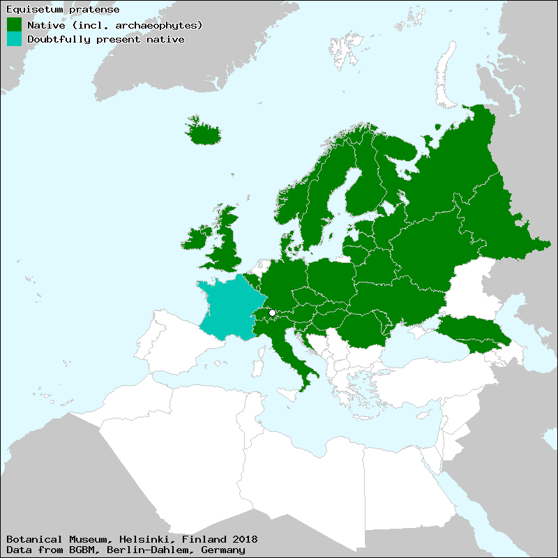 Common names: Hain-Schachtelhalm (German), Prêle des prés (French), Scuab eich mhóinéir (Irish Gaelic), Shade horsetail (English), Aasosi (Estonian), ängsfräken (Swedish), engsnelle (Norwegian), Equiseto pratense (Italian), lehtokorte (Finnish), livadna preslica (Croat), Lund-Padderok (Danish), pļavas kosa (Latvian), Praslička lúčna (Slovak), Prêle des prés (French), přeslička luční (Czech), Skrzyp łąkowy (Polish), travniška preslica (Slovene), vallbjølluvísa (Faroese), vallelfting (Icelandic), Wiesen-Schachtelhalm (German), Коада калулуй де-рытуре (Moldovian), Ливадски раставић (Serbian), хвощ луговой (Moldovian), хвощ луговой (Russian), Хвощ лучний (Russian)[Credits]
